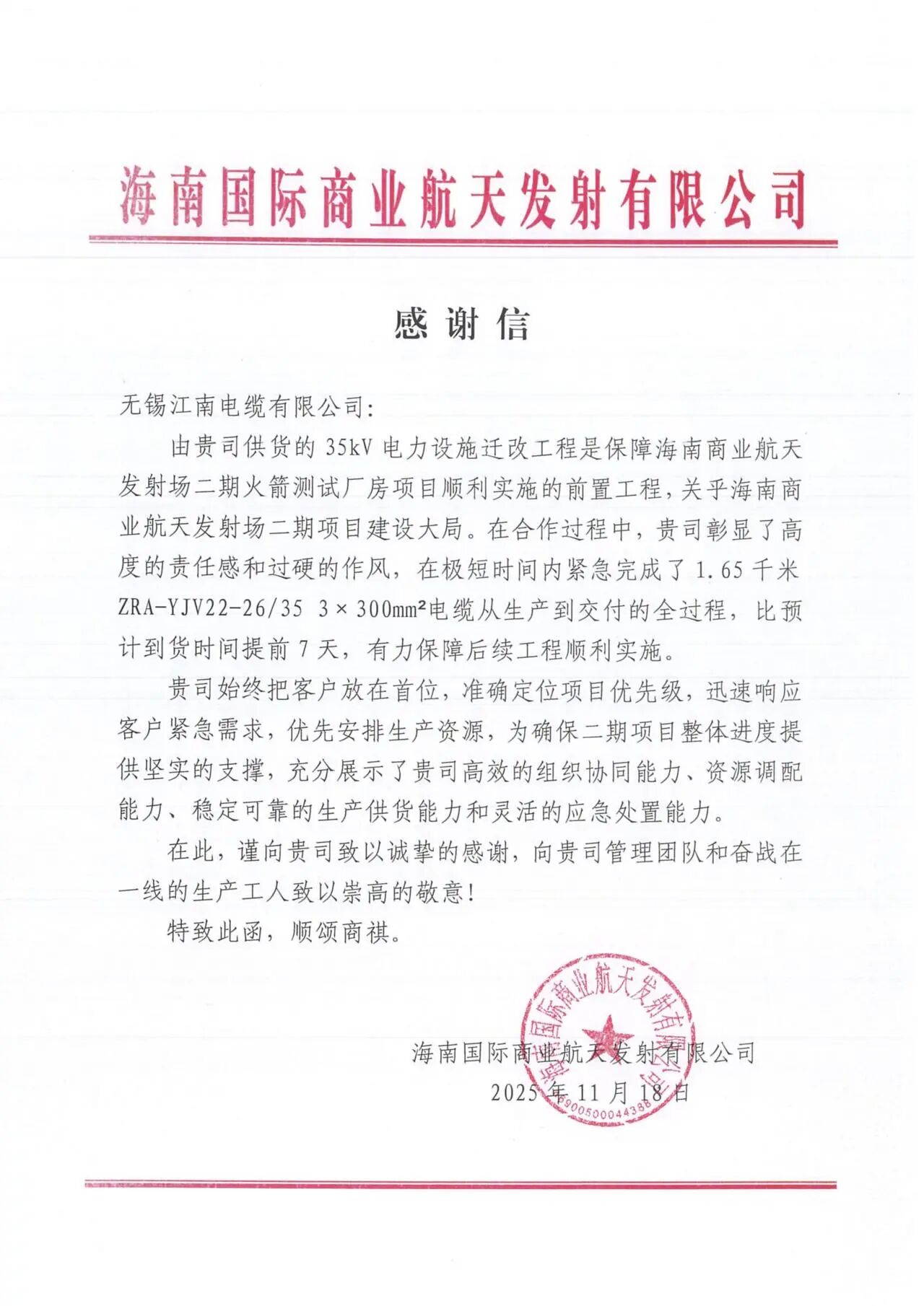 近日,江南電纜收到來(lái)自海南國(guó)際商業(yè)航天發(fā)射有限公司的一封感謝信,對(duì)公司高效的組織協(xié)同能力、資源調(diào)配能力、穩(wěn)定可靠的生產(chǎn)供貨能力和靈活的應(yīng)急處置能力,表示高度肯定!