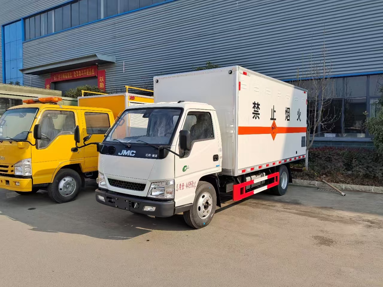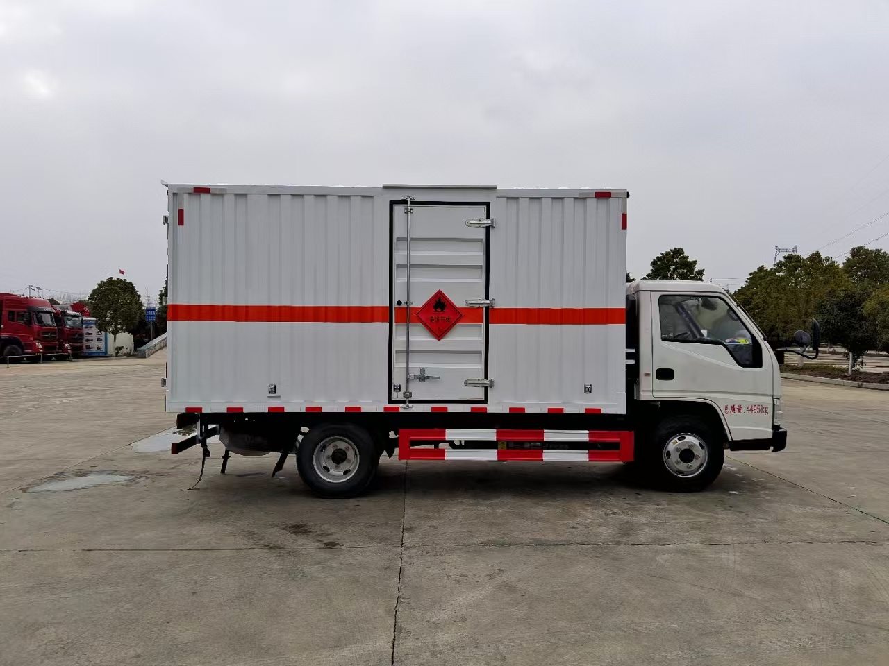 | 貨箱配置 | 廂體為雙層金屬骨架結(jié)構(gòu),外板采用冷軋鋼板,中間填充阻燃泡沫,內(nèi)飾為鋁板。底板為平板上鋪防靜電膠皮。廂內(nèi)兩側(cè)加裝固定貨物臥環(huán),門框帶防盜報(bào)警器,頂部帶煙霧報(bào)警器,廂體右側(cè)選裝側(cè)門,隨車配2個(gè)滅火器,危險(xiǎn)標(biāo)志牌,防火帽,危險(xiǎn)品三角頂燈。 | ||