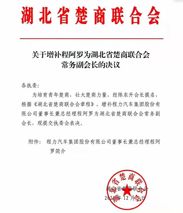同月中下旬,程阿羅總經(jīng)理先后被湖北省楚商聯(lián)合會增補為常務副會長,并被隨州市中級人民法院、隨州市公安局聘請為“法制化營商環(huán)境監(jiān)督員”,并聽取湖北省高院征求代表委員意見。