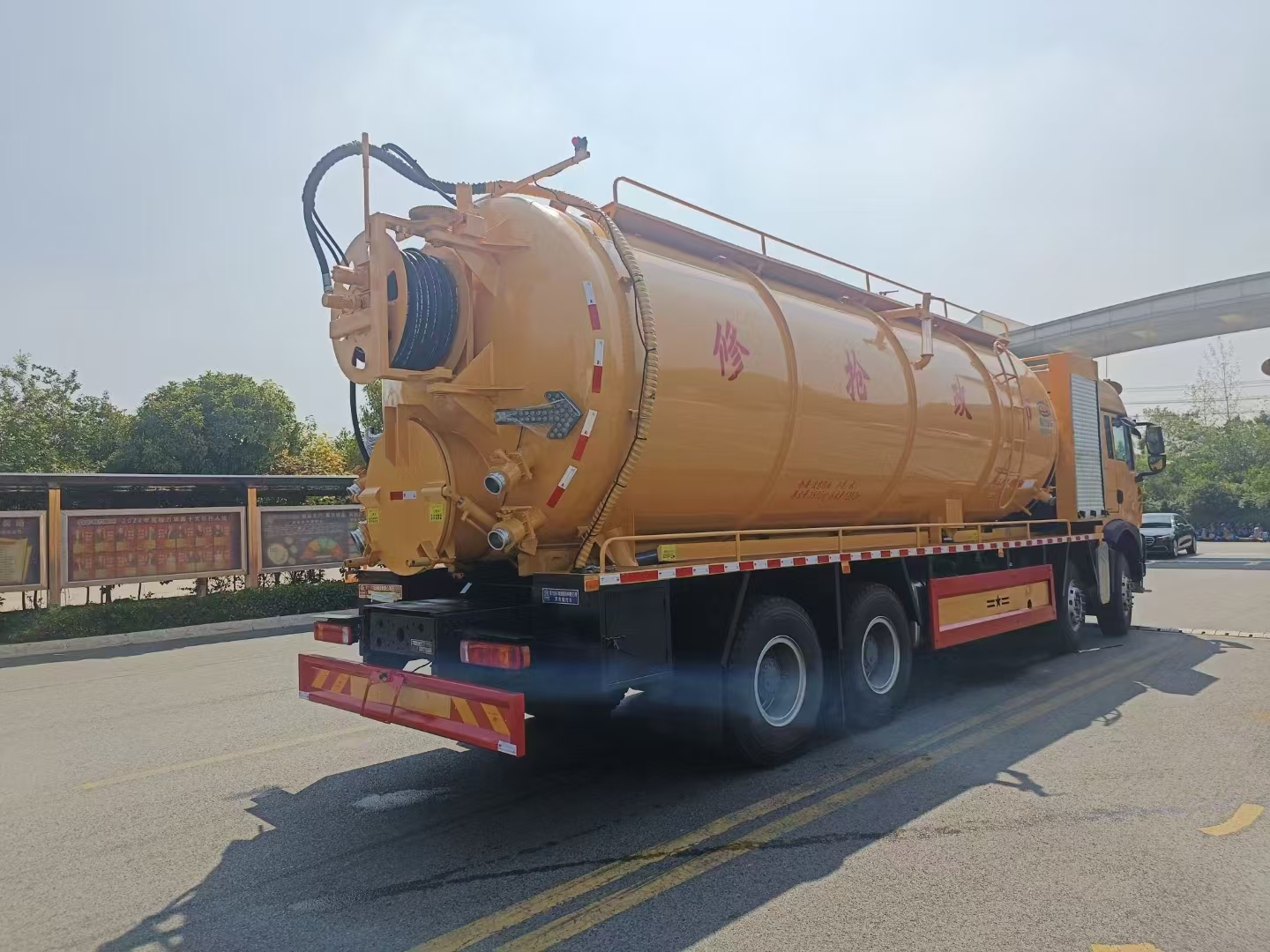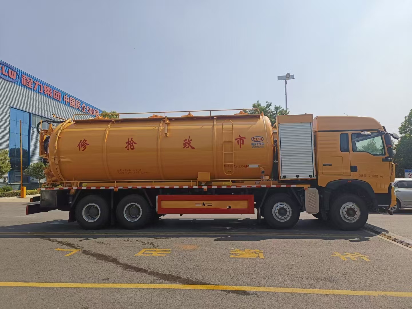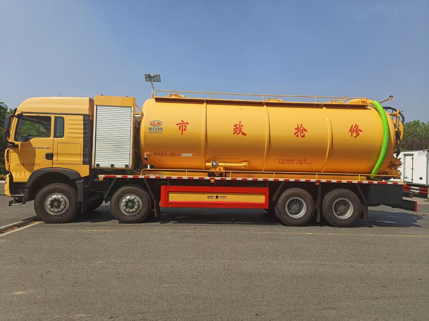 上裝配置 罐體總?cè)莘e約33立方,清水箱約10立方,其余為污水罐,加強(qiáng)大架,兩倉(cāng)互通,采用8mm碳鋼制作,吸污部分,副發(fā)采用420馬力配258水循環(huán)泵,8米吸污管,罐體兩側(cè)加寬平臺(tái)加護(hù)欄,后部開一個(gè)600mm液壓開啟排污口,一個(gè)150排污球閥,和一個(gè)100的排污球閥,100內(nèi)抽球閥,后部左右各一個(gè)箭頭燈,配品浮350流量,配100米內(nèi)徑25定制耐磨高壓管,帶卷盤,卷盤液壓左右旋轉(zhuǎn)。